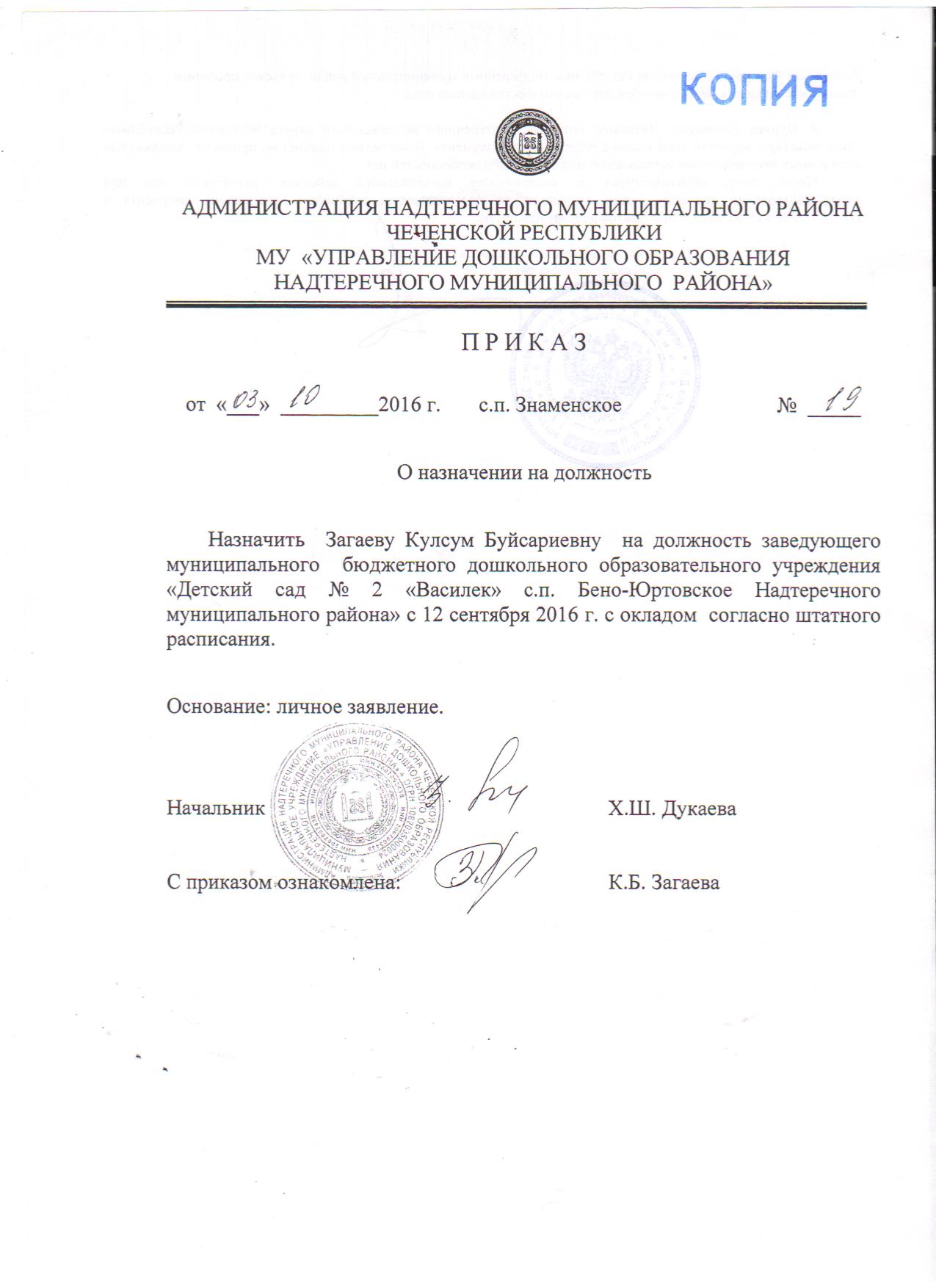Приказ № 52 - од от 02.04.2019 ""О внесении изменений в Правила приема детей на обучение по образовательным программа МБДОУ "Детский сад №2 "Василек" с.п. Бено-Юртовское